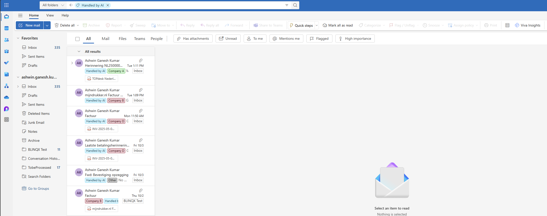 De e-mail krijgt automatisch de juiste labels, zoals ‘Handled by AI’ of ‘Finance’ en wordt in de juiste map geplaatst.